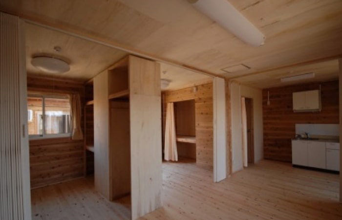 The main feature of this series of structures that was designed and built as part of the 1st phase of the massive relief and reconstruction efforts following the devastating earthquake and tsunami of March 2011 are the square logs made from local Sugi.